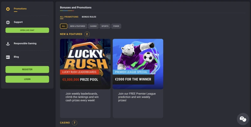 | Tilgjengelige bonustyper | Velkomstbonuser, ukentlig spilleautomattilbud, turneringer, sportsbook-velkomsttilbud, VIP-tilbud |